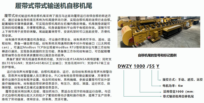 履帶式自移機尾由剛性皮帶機尾與履帶行走底盤組成,采用鉸接式連接結構。其核心部件包括:
